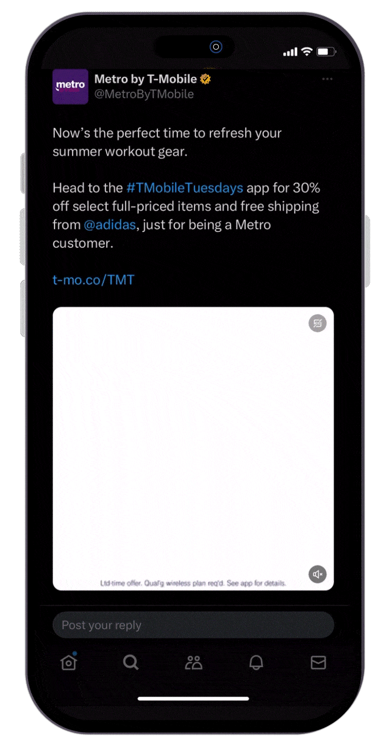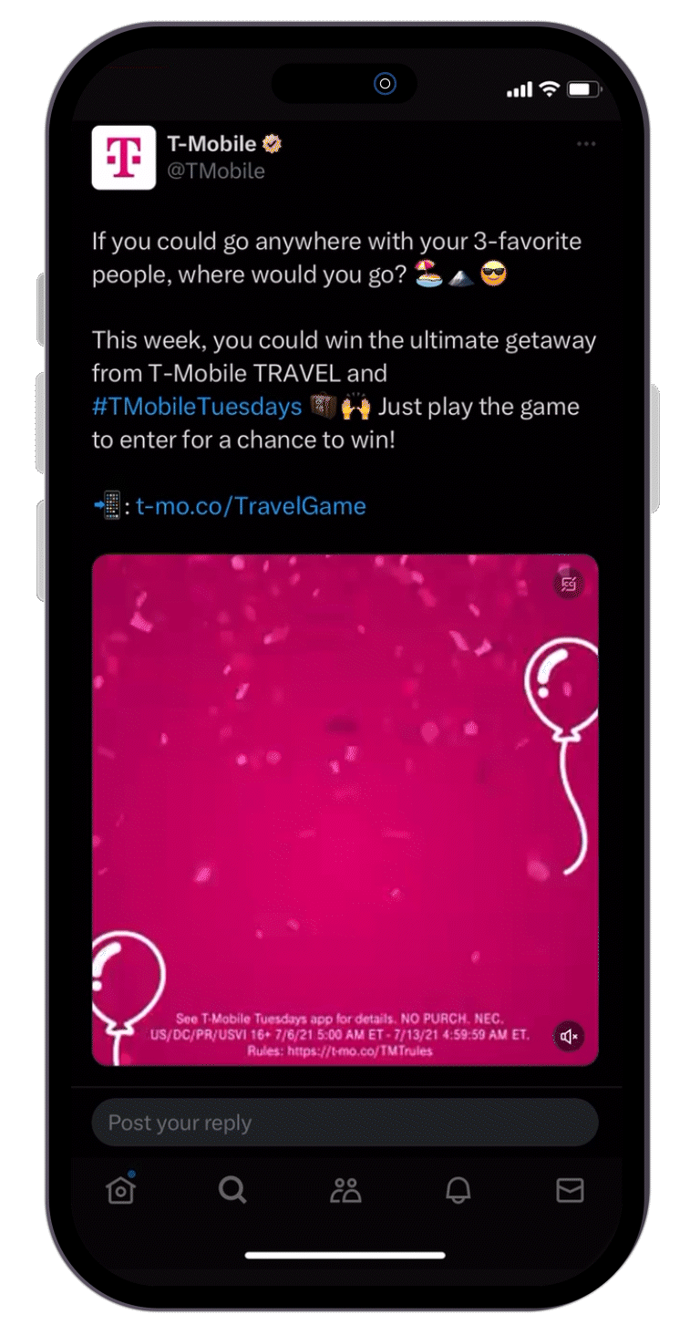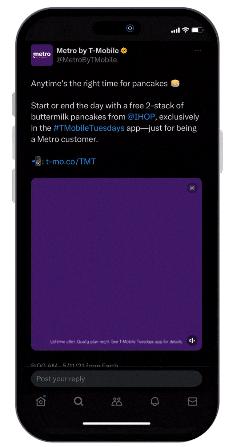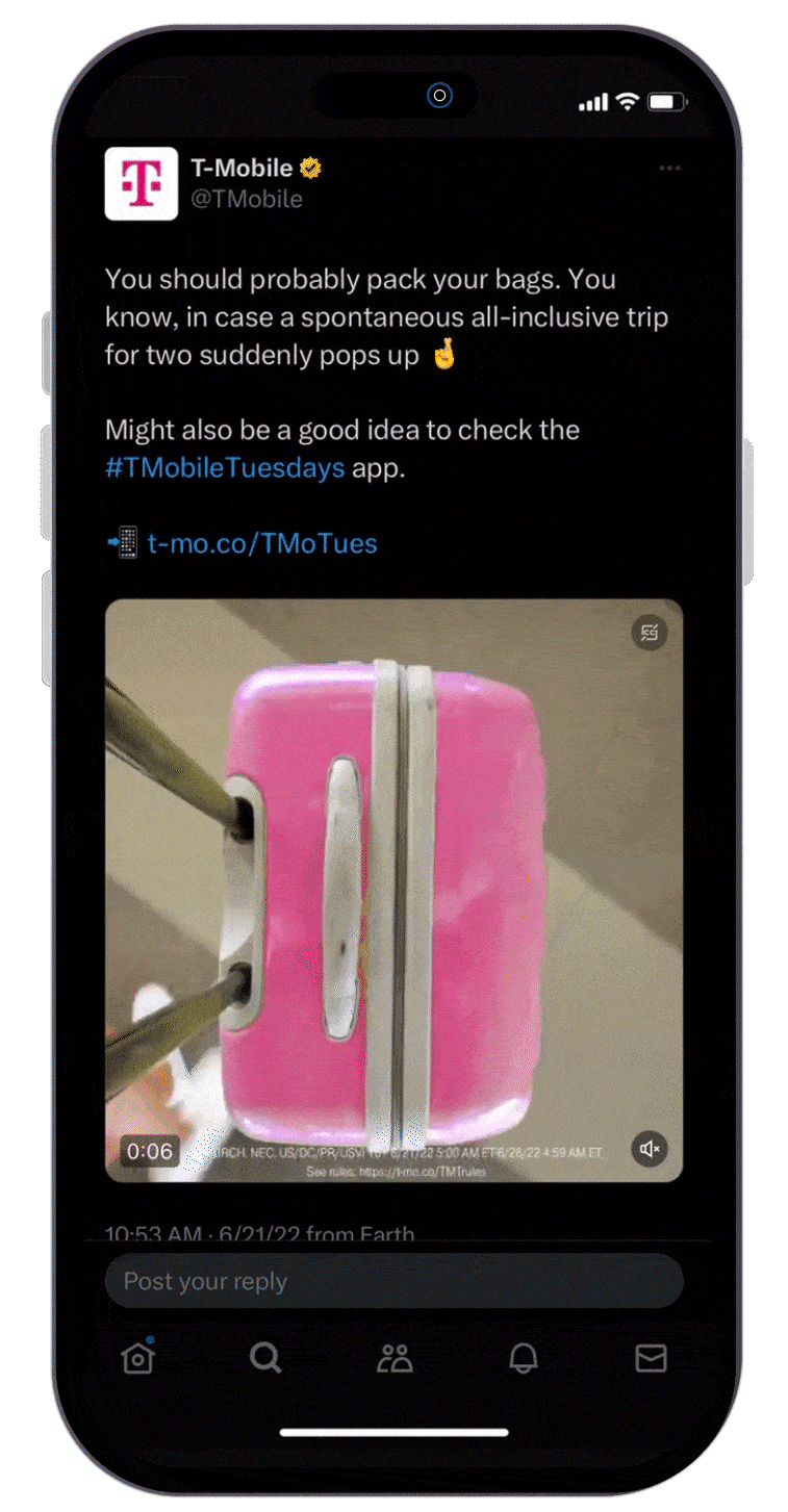 During my inaugural year at T-Mobile, I collaborated with the dynamic T-Mobile Tuesdays team. My main responsibility involved crafting an array of social media ads spotlighting the exciting perks awaiting customers each week. The spotlight for these promotions predominantly shone on Twitter, our primary hub for customer engagement. Below, you'll find showcases of a few projects close to my heart. Teaming up with talented copywriters, we churned out vibrant and playful creative assets designed to captivate attention and drive more traffic to our T-Mobile Tuesday app.