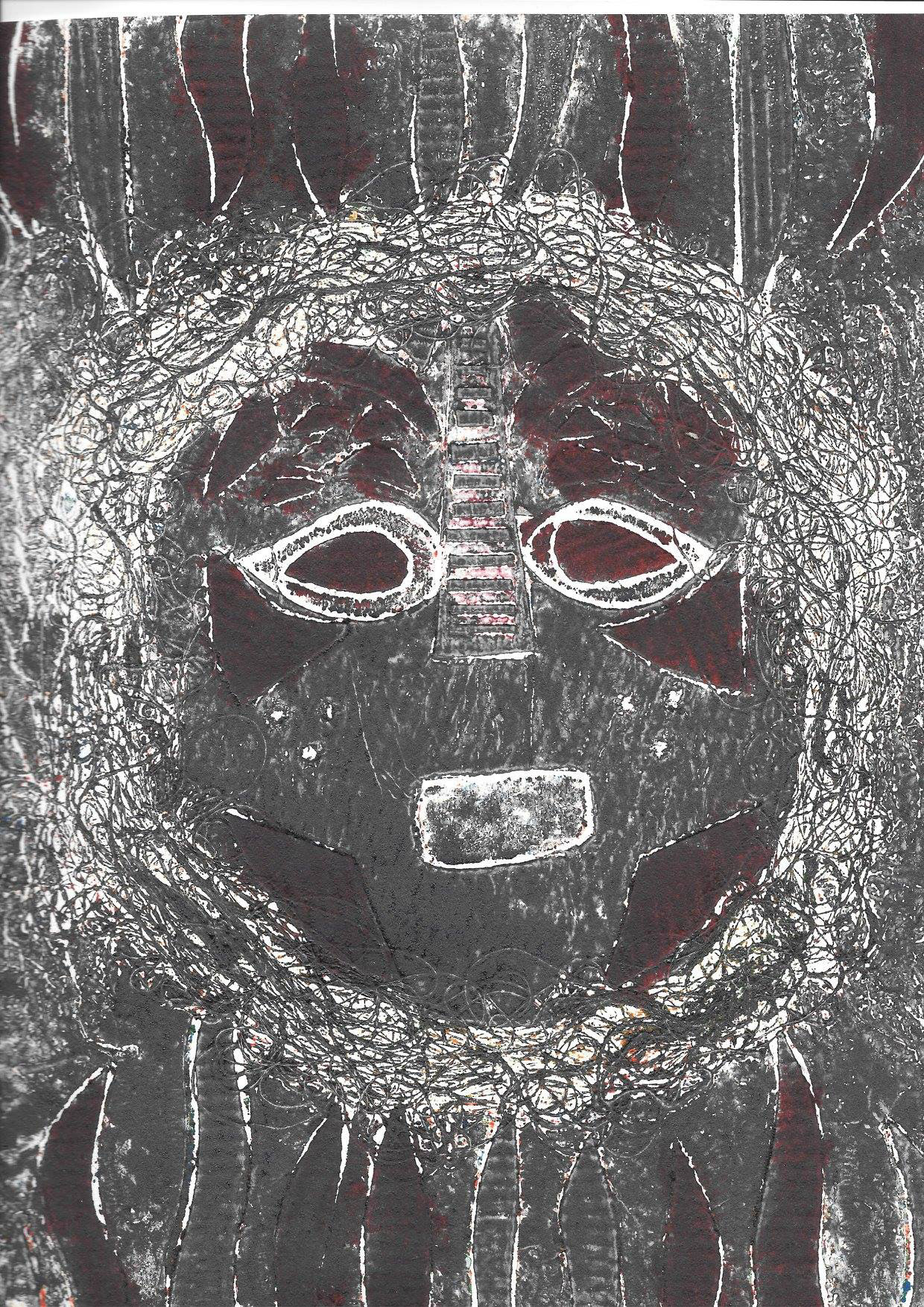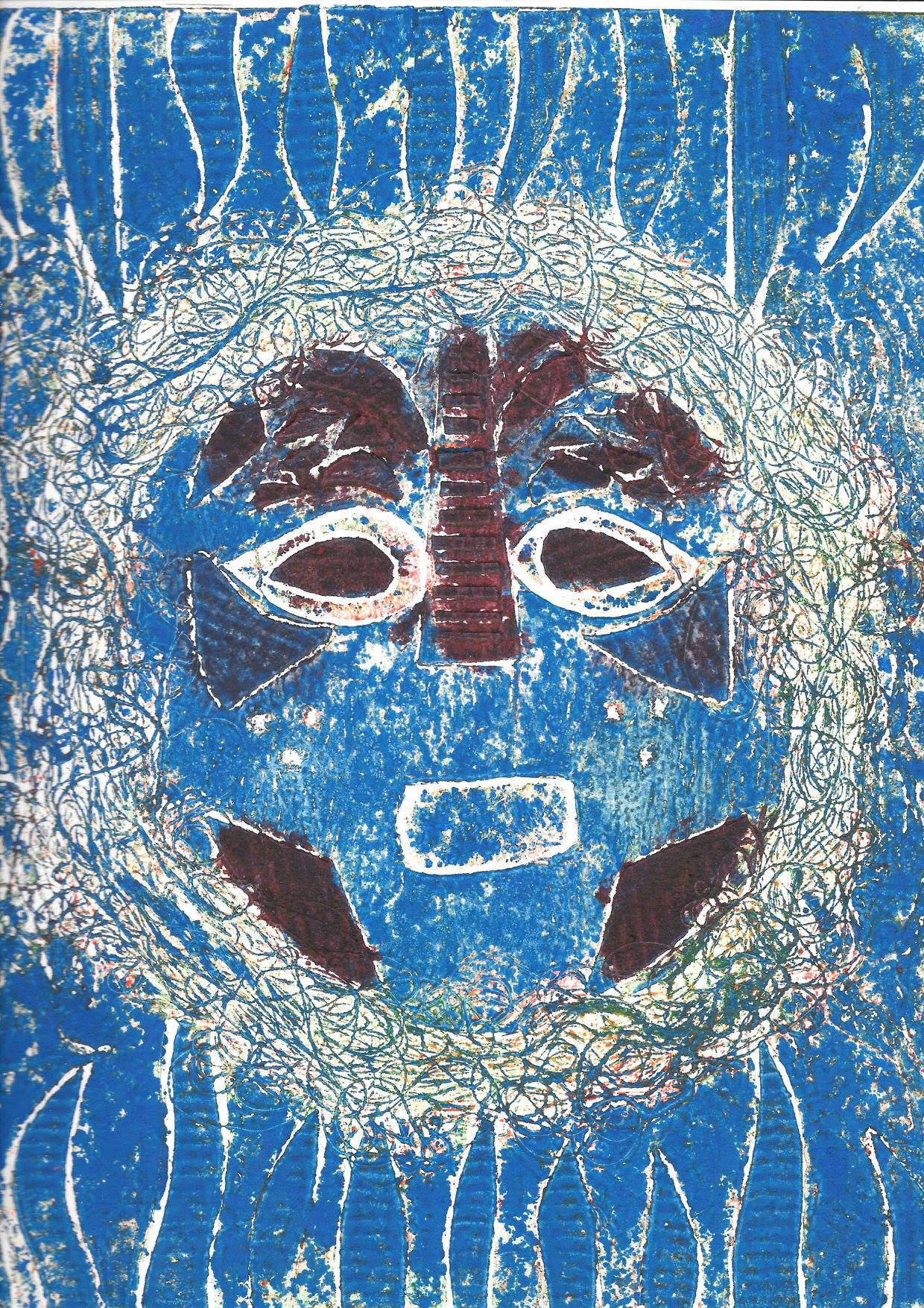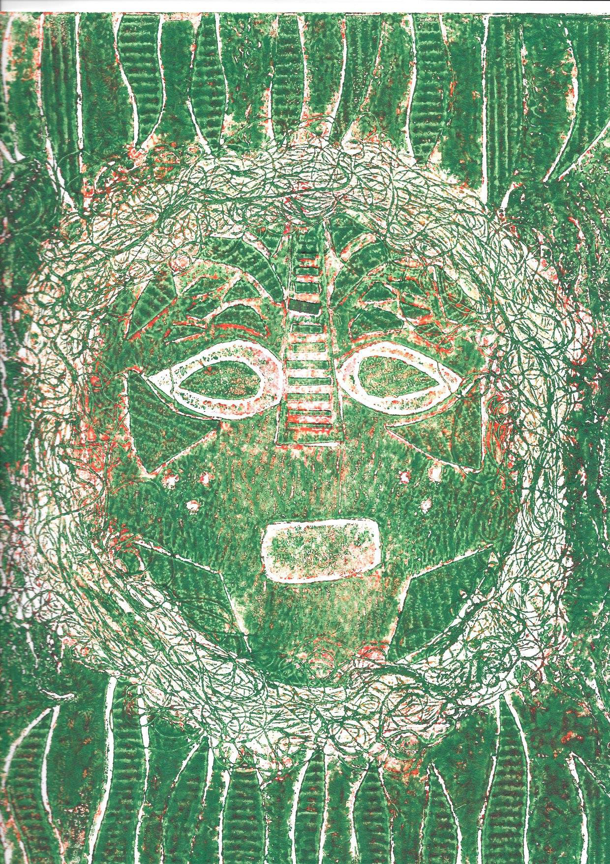 This is a printmaking project I had done called "Tribal Man". I used the same plate but different colored inks to make each edition.